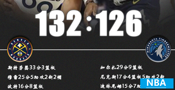 第四节森林狼罗布-迪林厄姆拿下10分,掘金斯特劳瑟拿下16分,最终森林狼126-132不敌掘金。