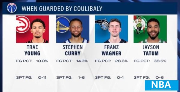 转播商公布了一组数据,本赛季,球星在库利巴利的防守下投篮表现: