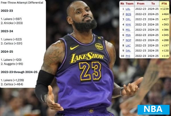 12月6日消息今天,Bleacher Report记者Andy Bailey列出了过去三个赛季湖人队罚球差的前两个。